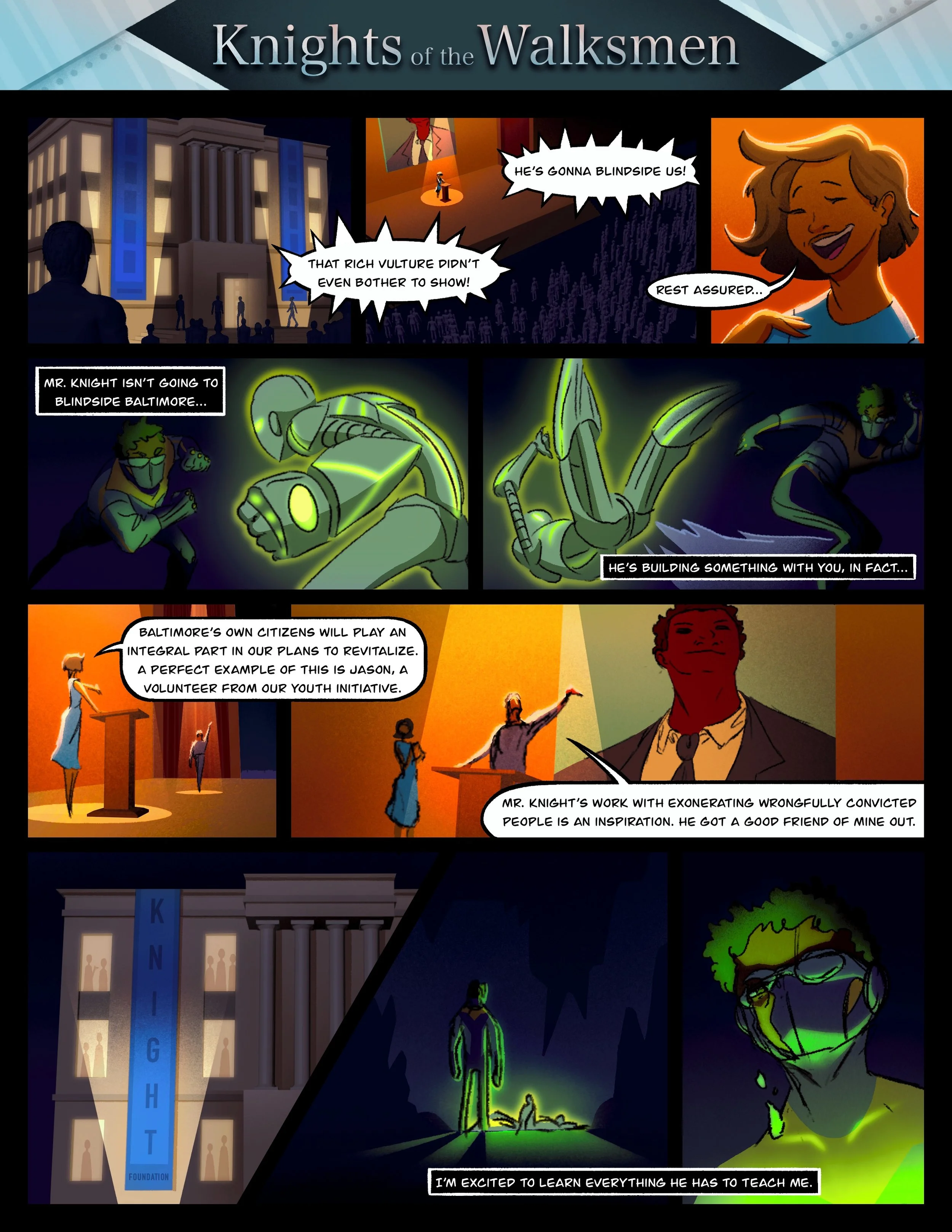 I created character designs, lettering and color work for the start-up’s animation studio, Fable Source. I worked on comic pages introducing 3 future storylines to be funded through Kickstarter. I worked in a small team that met bi-weekly for brainstorming and progress checks.